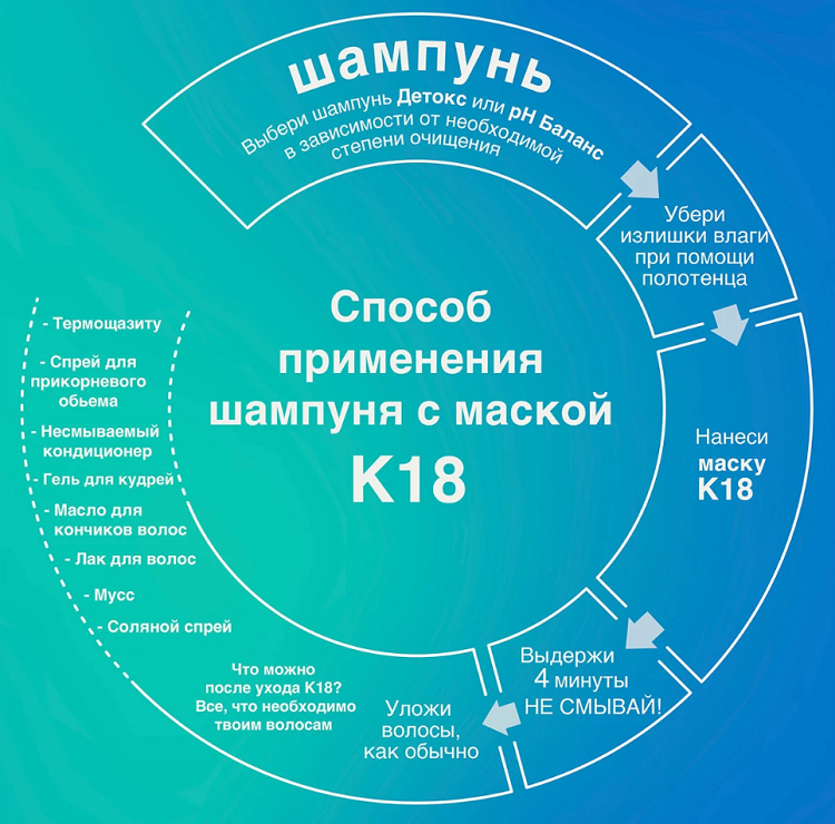 - Идеально сочетается с Несмываемой маской для молекулярного восстановления волос К18;